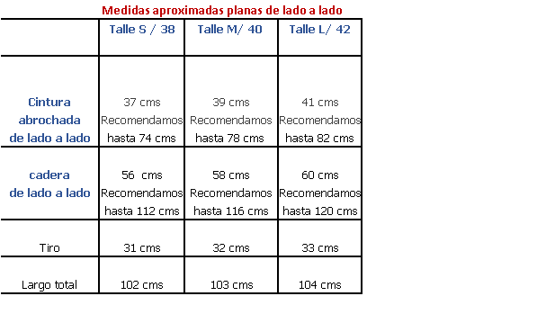 El de la foto es talle S/38 . A Paola le queda sueltito de cintura